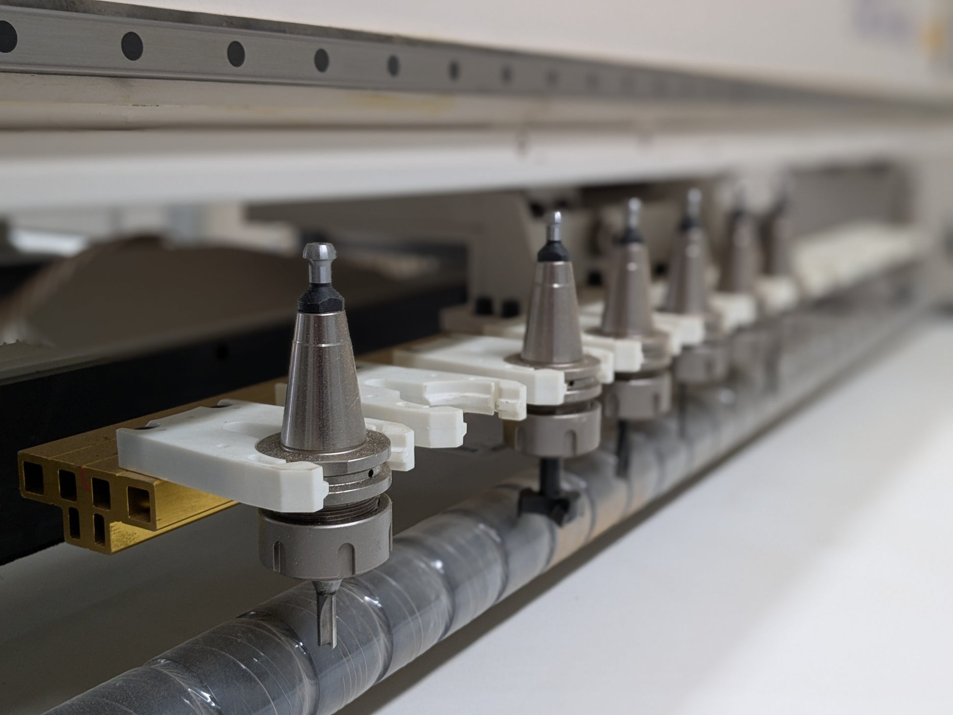 - 12-Tool Linear Automatic Tool-Changer (ATC) attached to gantry for faster tool changes