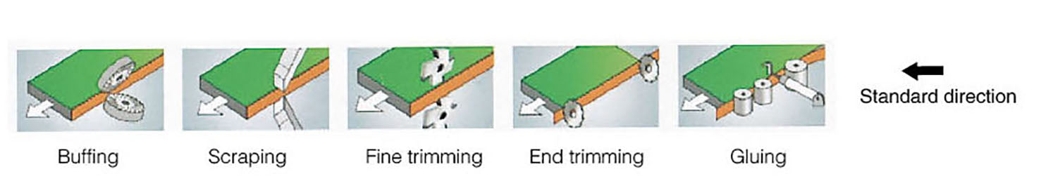 Gluing - End cutting - Fine trimming - Scraping - Buffing